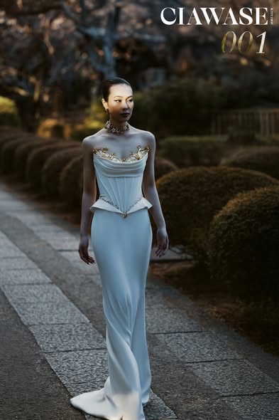 Ciawase 001 là chiếc váy mang mã số đầu tiên của bộ sưu tập, mang trong mình tính chất đặc trưng của chuỗi những thiết kế sau đó. Form váy đuôi cá kết hợp với thân trên corset hiện đại, drapping xếp lớp tạo điểm nhấn đầu tiên ở phần ngực, tiếp đến là chi tiết hoa bằng vàng đồng, khẳng định thêm quyền lực và sự độc đáo của váy.