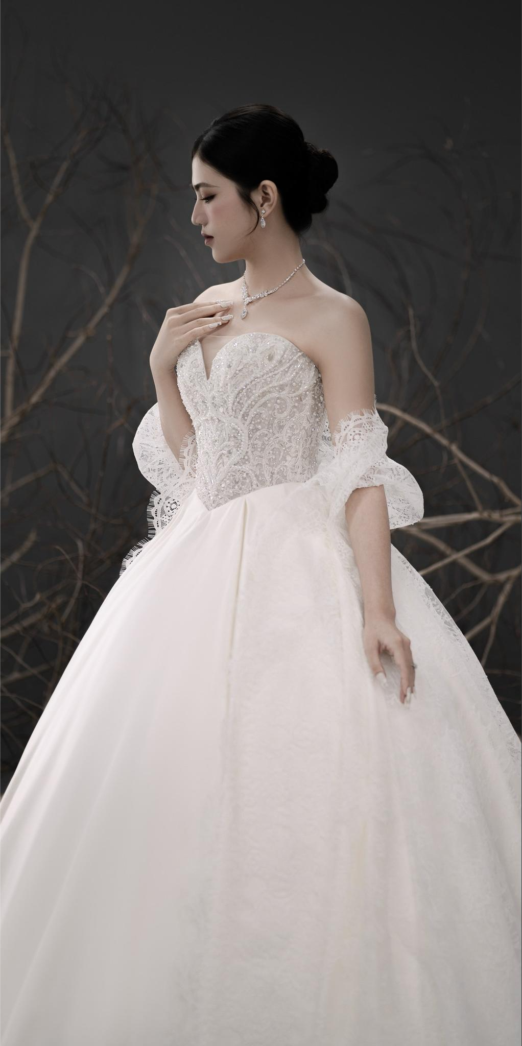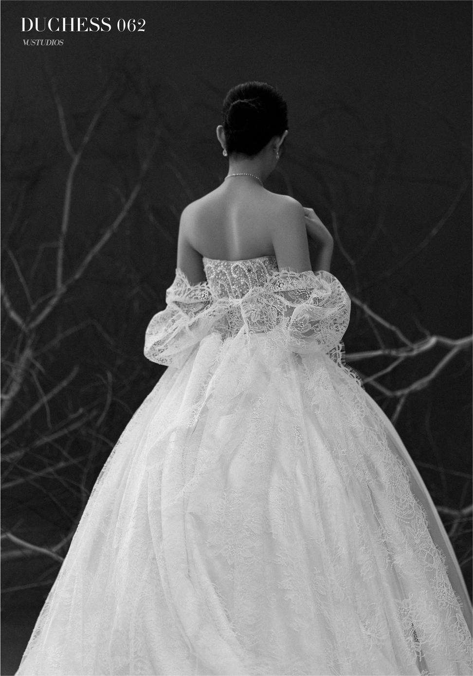 DUCHESS 062 kết hợp đẹp nhất với veil cùng chất liệu, có thể sử dụng găng tay và choàng ren nếu cô Dâu muốn mình trở nên đặc biệt hơn một xíu nữa, lúc đó, điểm nhấn của váy sẽ được tinh tế phân bố đều, là chất liệu tuyệt vời cho những hình ảnh được ghi lại trong ngày cưới của quý khách.