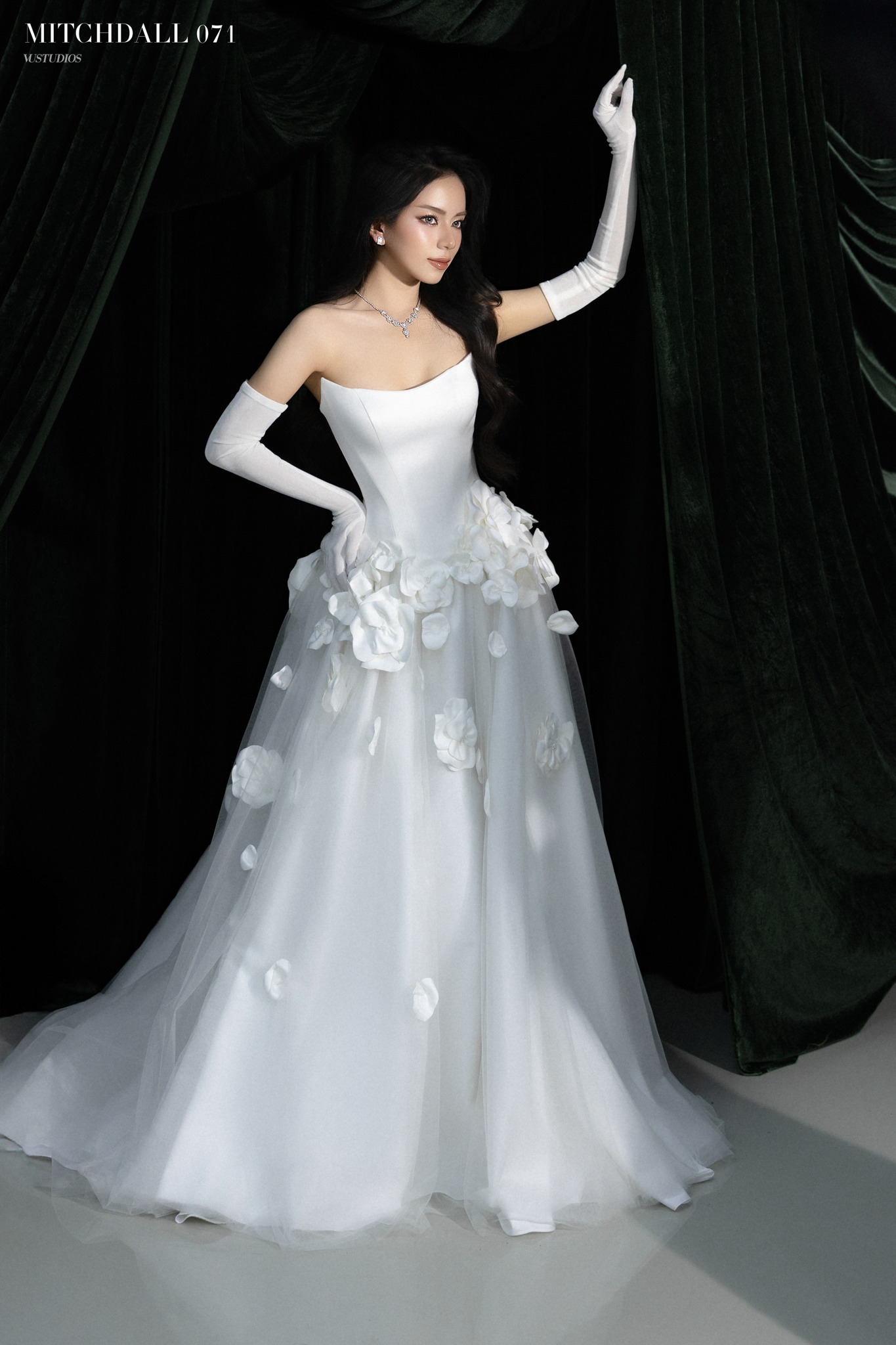 Đắm mình trong ánh sáng dịu nhẹ, từng đường cong được tôn vinh bởi lụa mềm mại và điểm xuyến những đóa hoa 3D thủ công tinh xảo. Một sự căng thẳng đầy ý vị khẽ lan tỏa — giữa lãng mạn và tiết chế.